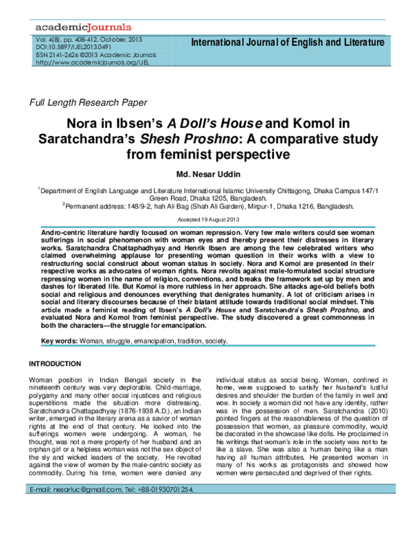 Pdf Nora In Ibsen S A Doll S House And Komol In Saratchandra S Shesh Proshno A Comparative Study From Feminist Perspective Nesar Uddin Academia Edu